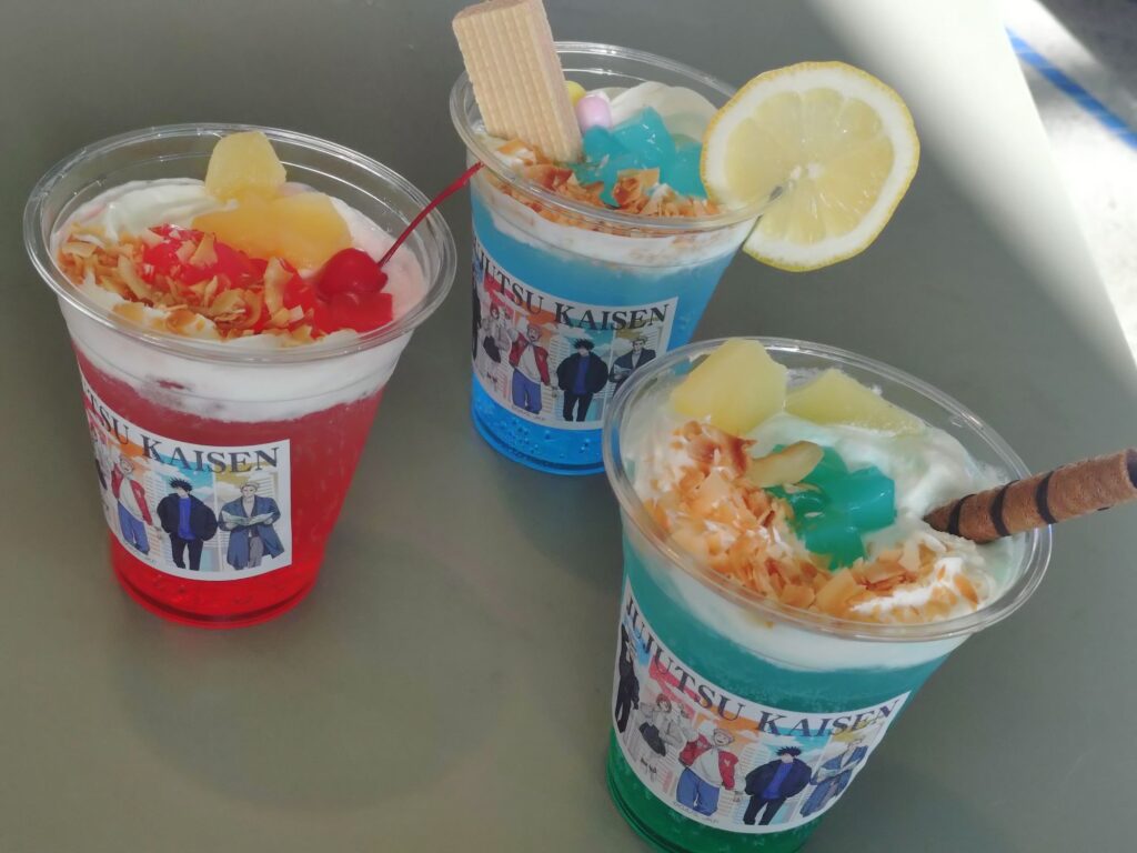 トッピング構成は虎杖悠仁のマンゴーソーダと似ています。エメラルドグリーン色したドリンク(パインシロップが入ったサイダー)の上に生クリーム、パイナップル果肉、パインシロップで色付けされたナタデココ、ドライココナッツスライスとトッポみたいなお菓子が刺さっていました。