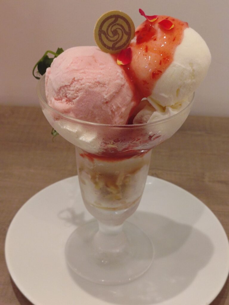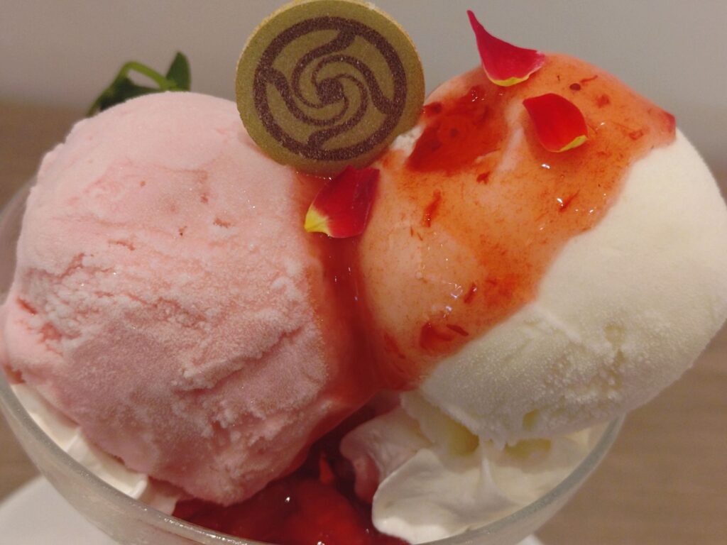 彼女のは白と桃色のアイスに薔薇の花びらがと赤のソースがアクセントになっており、3人の中の紅一点かつ可愛らしさを見事に表していると思います。
