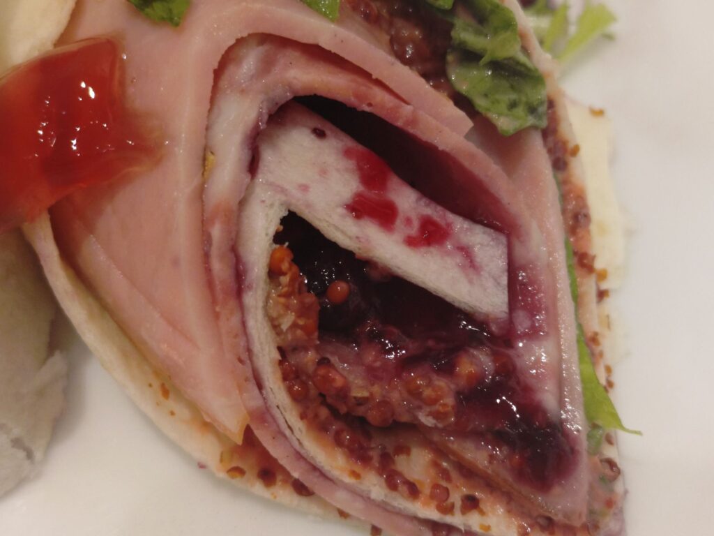 トルティーヤは粒マスタードとブルーベリーのジャム?が、使用されています。