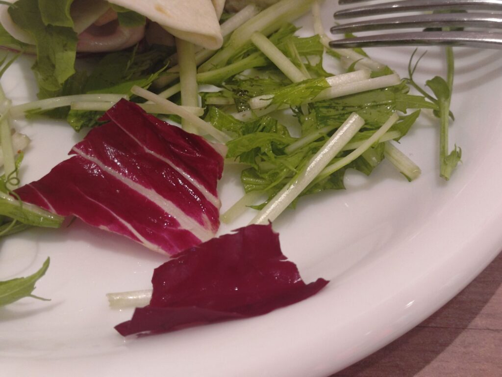付け合わせサラダの中にある紫色のレタス?が凄く苦いです。舌に苦さが残ります。