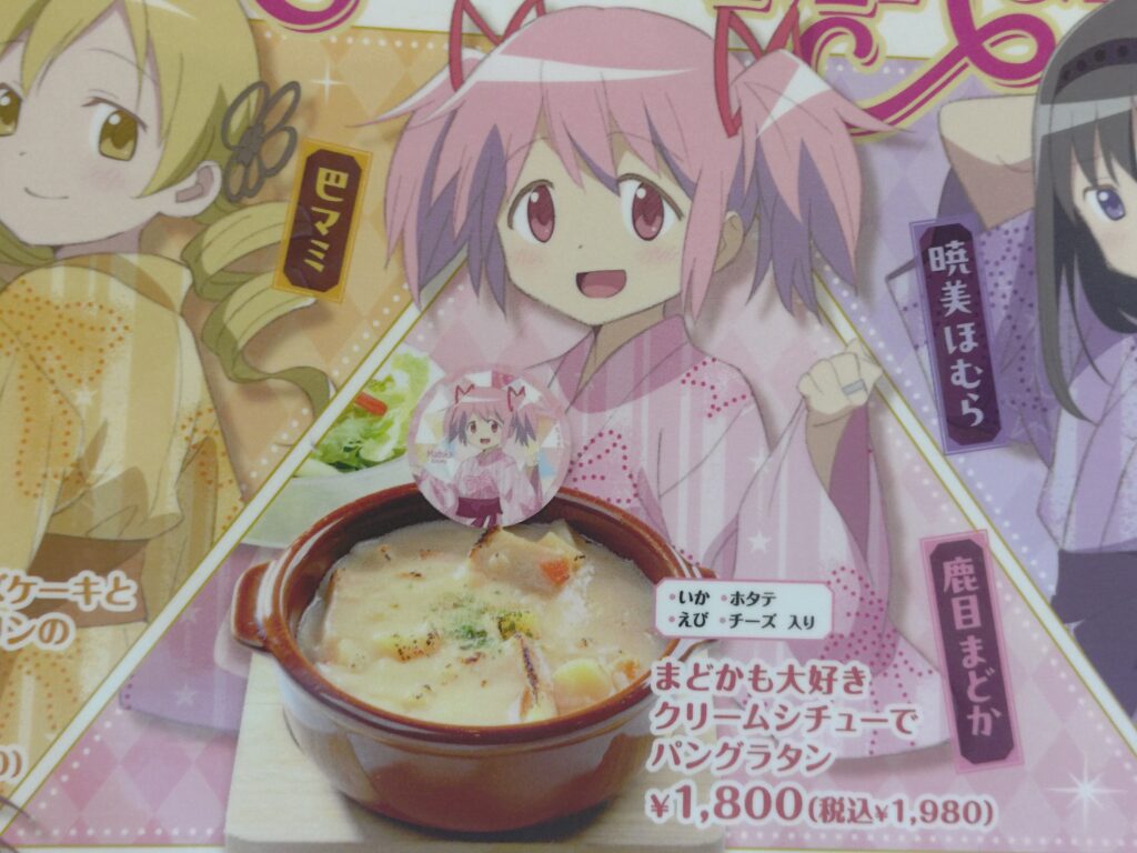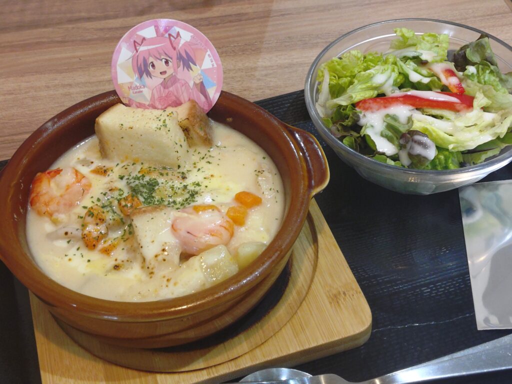 公式の「鹿目まどかへの100の質問」でクリームシチューが好物と答えていたためかこのメニューといったところでしょうか。