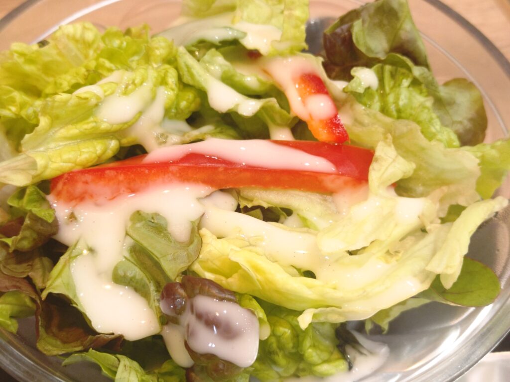 レタスメインの生野菜のサラダで全体を通してシャキシャキした食感で美味しい。