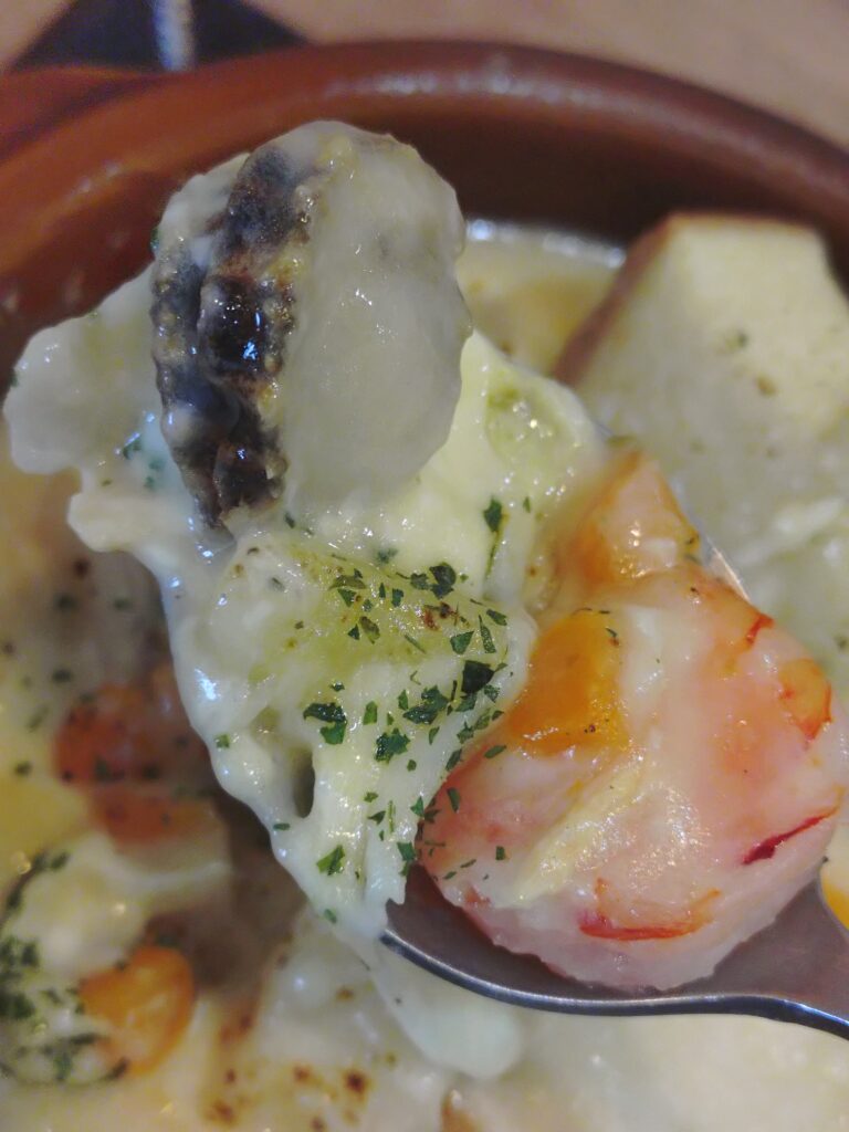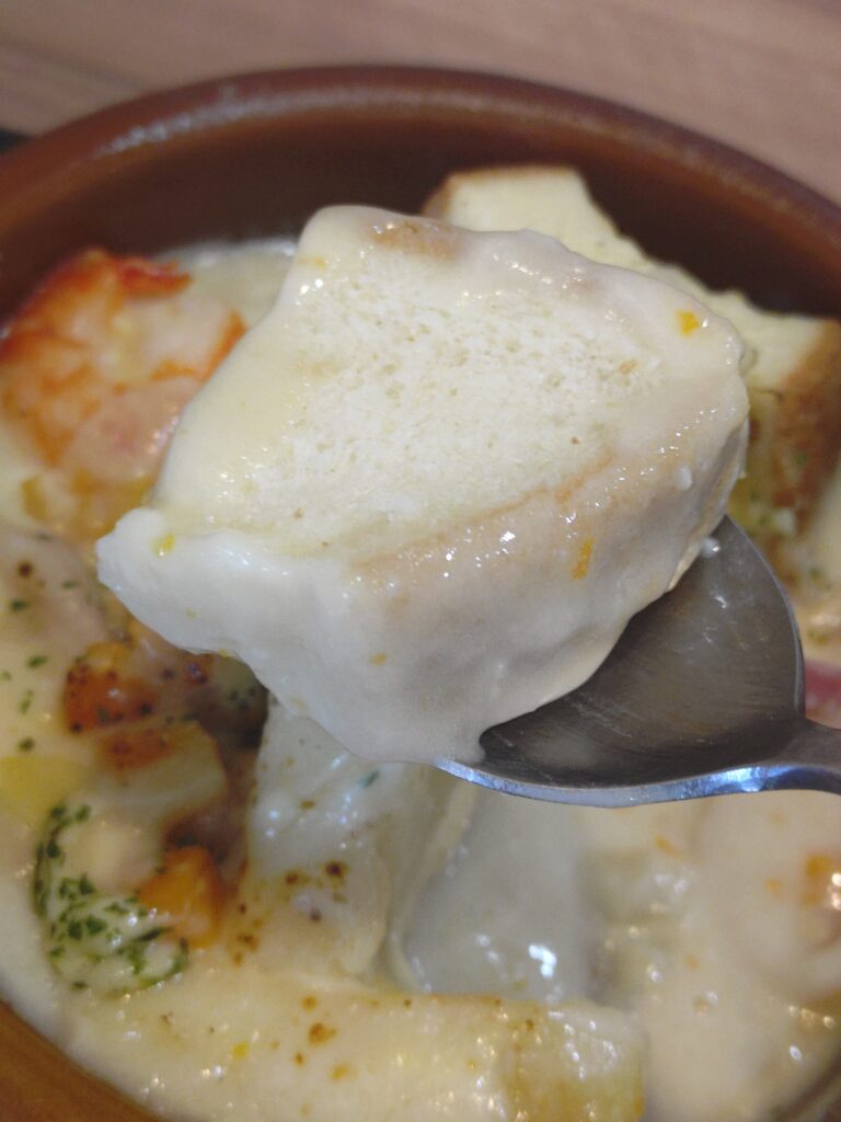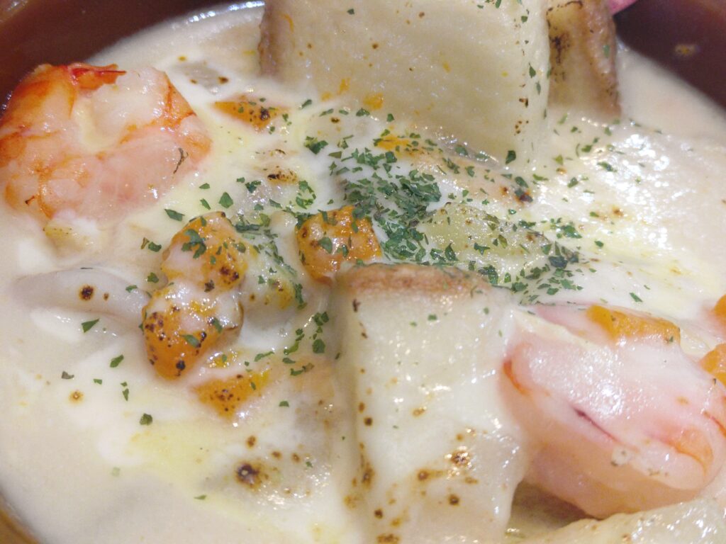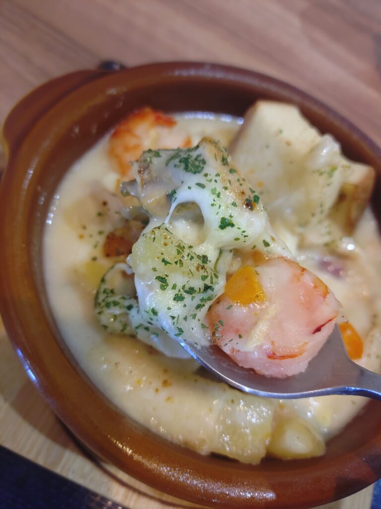 パングラタンはイカ、ホタテ、エビなので大分贅沢なシチュー。