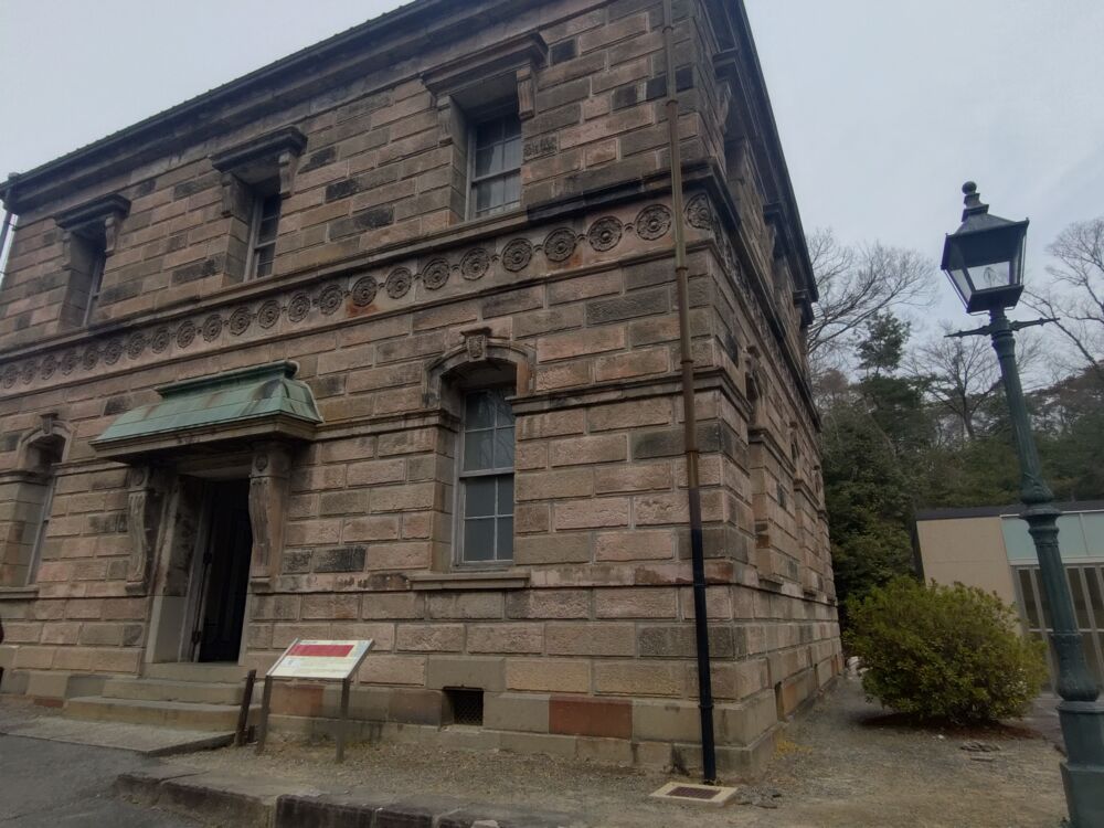 奥にある建物と合わせて撮ると明治村に来ている5人という雰囲気を感じられる写真が撮れます。